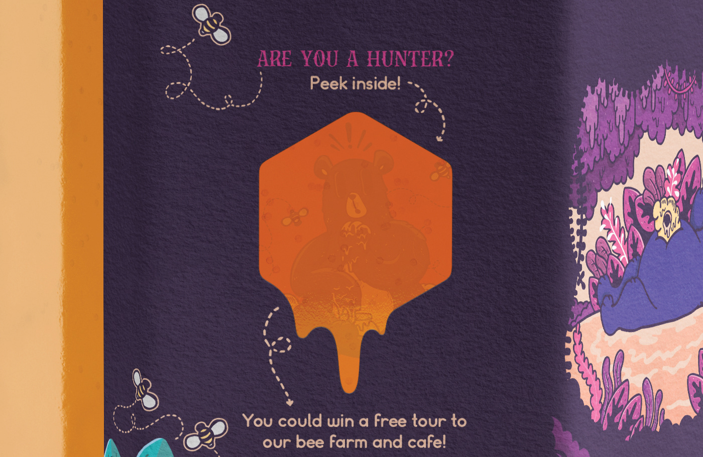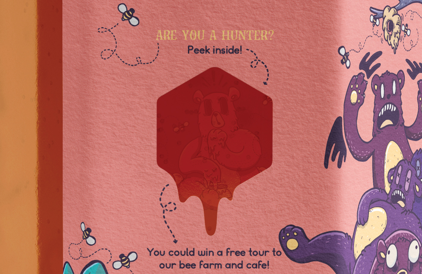 I created a unique label that would be applied to the honey jars which includes a special cut out and double sided printing. This is used for an online campaign where buyers could win a tour of the honey farm and cafe, with a chance to meet the bears themselves. A limited run of ‘winning’ labels were printed with a hidden bear and code word for people to find.