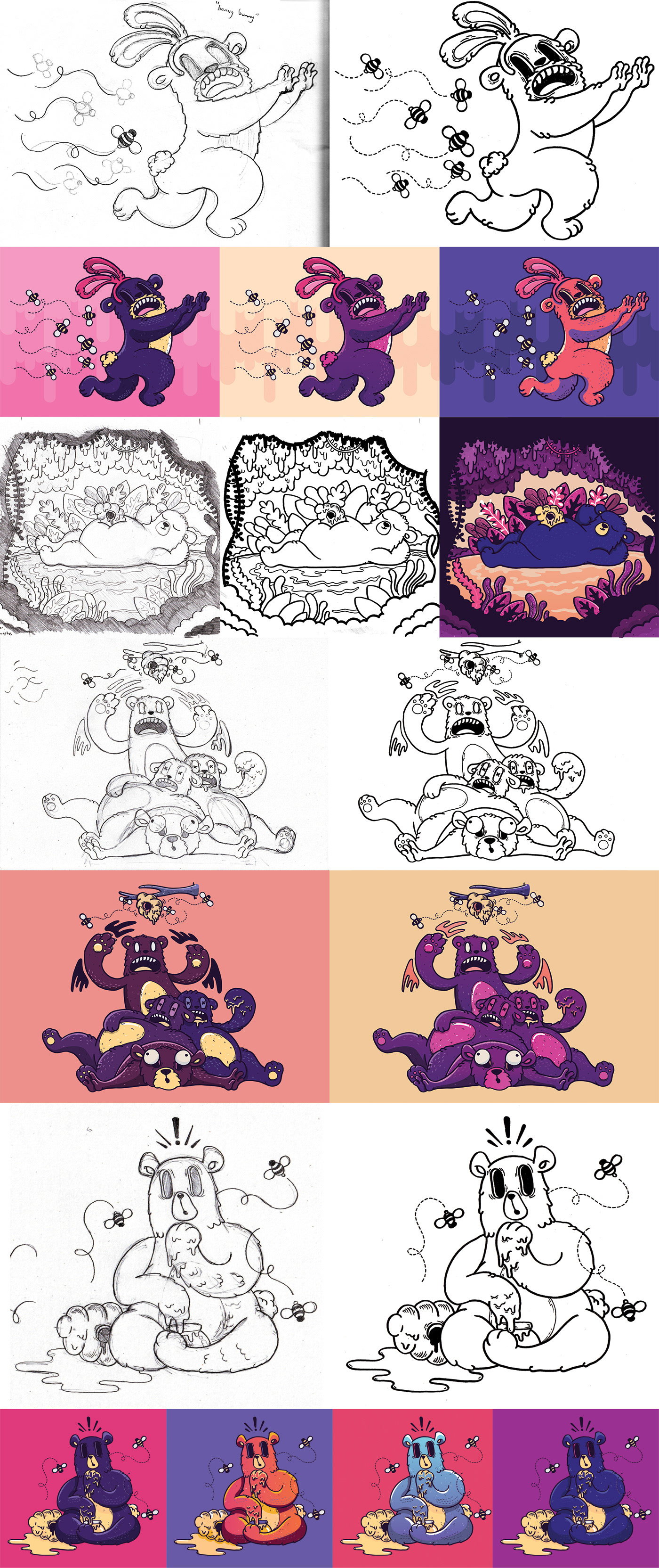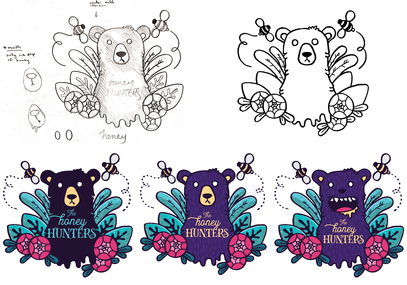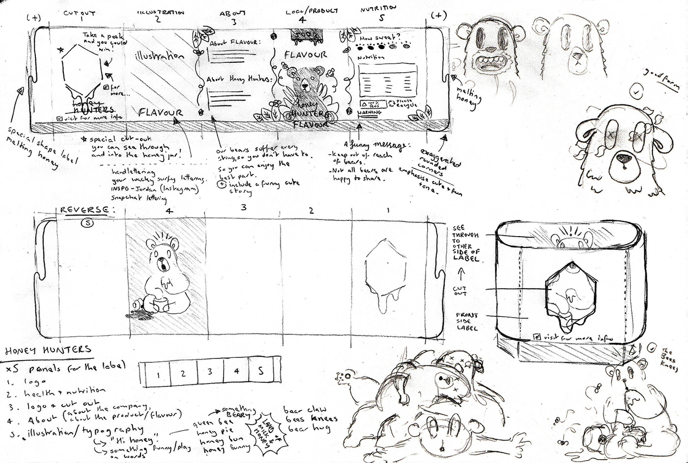Once the logo had been finalised I began sketching illustrated characters, which would be included on the packaging. Each illustration reflects the flavours of the honey. This process was similar to the logo process: pencil, ink, digitalise.