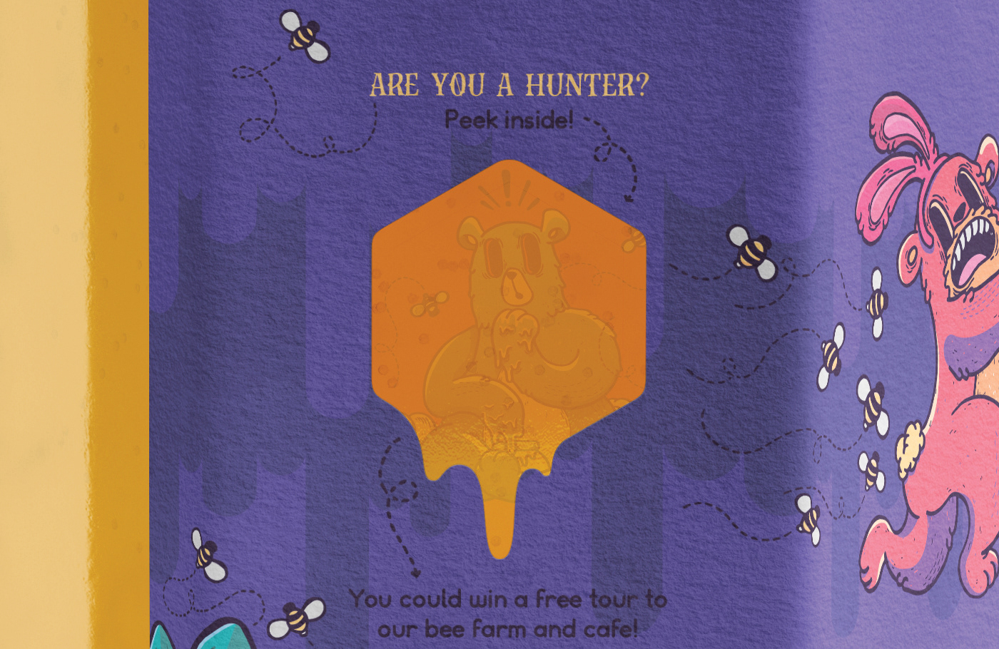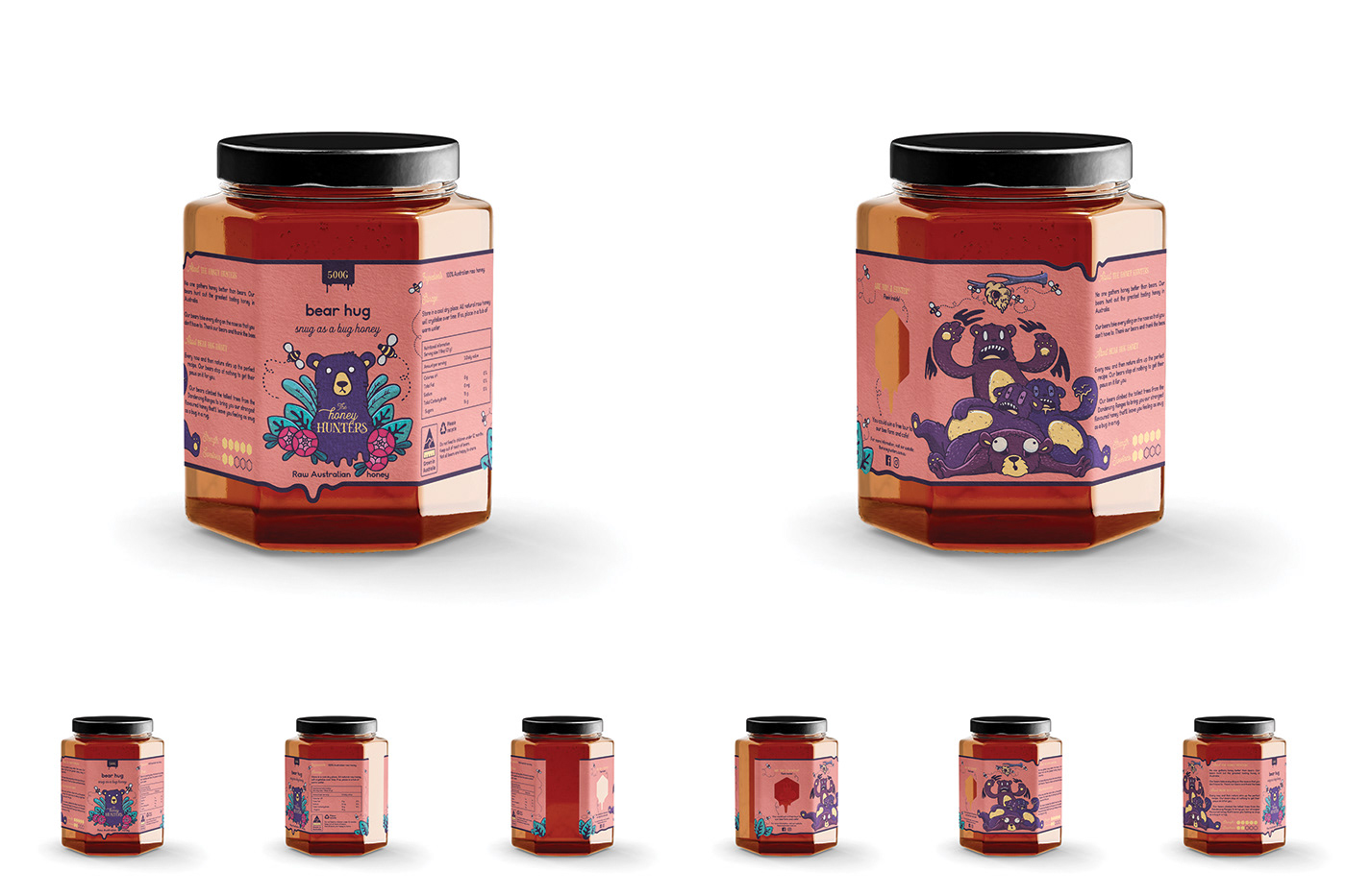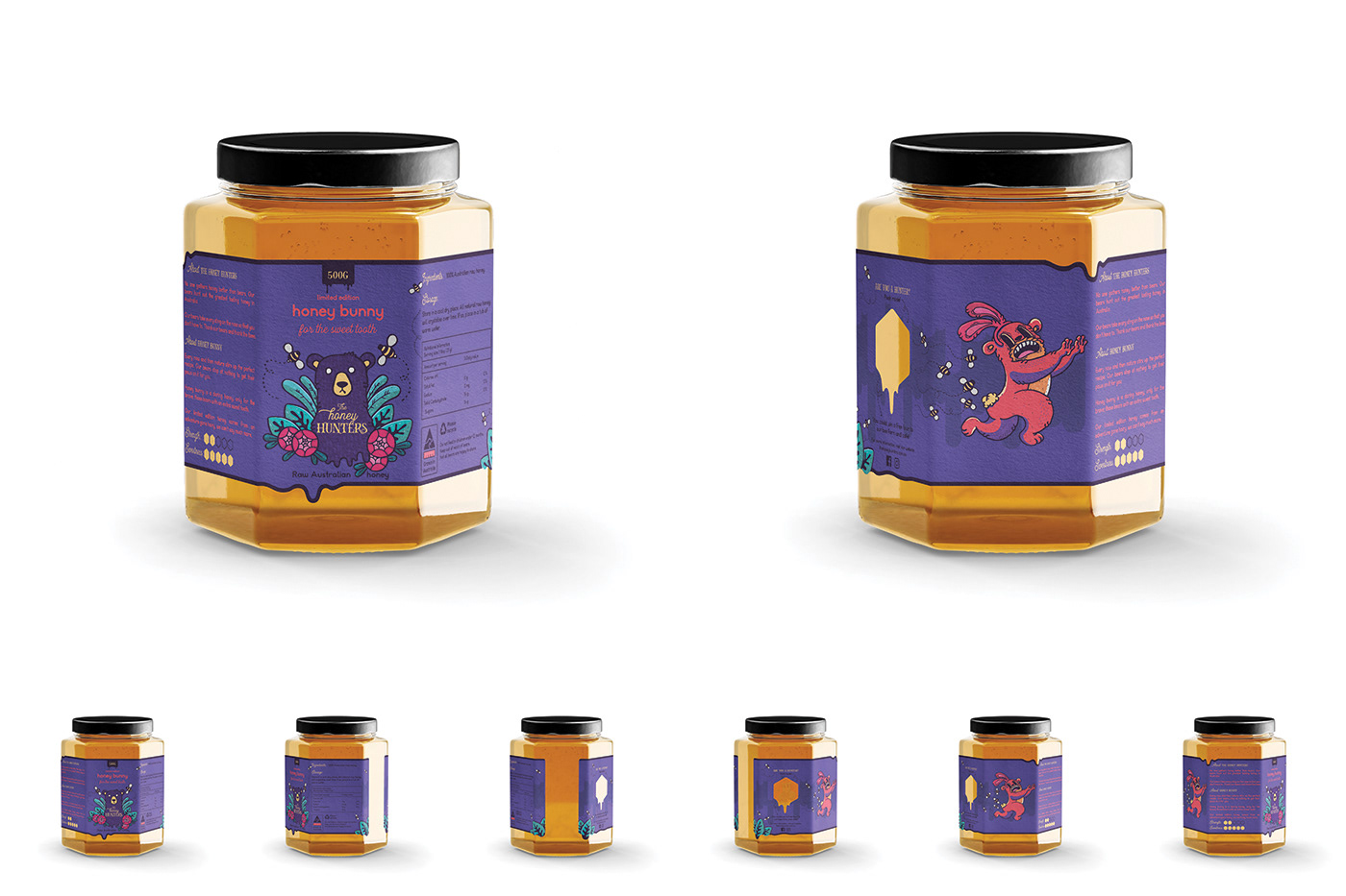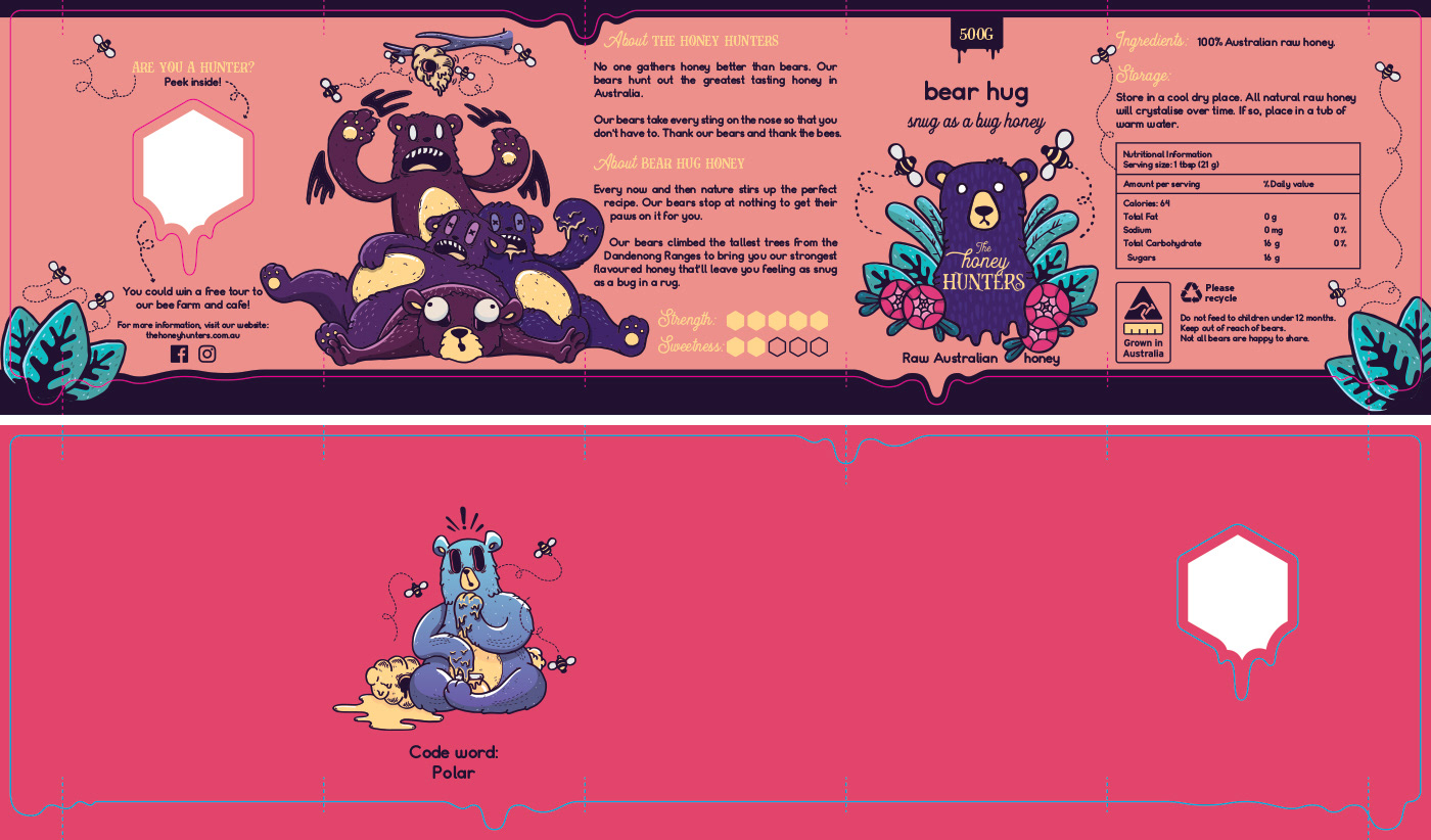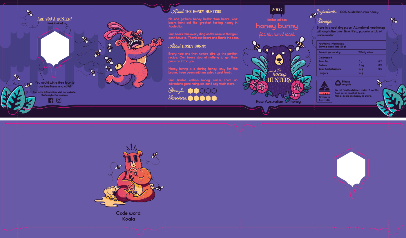 Below is the final label packaging artwork, including The Honey Hunters logo and illustrated characters. The label artwork includes the die line overlaid and shows both the front side art of the label and the reverse side art of the label. The reverse side shows art of the limited run of 'winning' labels. All other labels do not include the secret bear and code word.