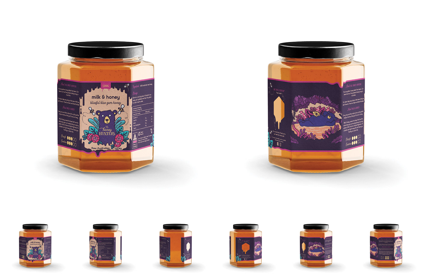 The Honey Hunters are a group of Australian bears that bring nature’s best recipes to honey enthusiasts. I had the opportunity to work with these gentle giants to design a logo and product packaging while including my passion for illustration. The Honey Hunters currently have three different flavoured honeys for you to taste: Bear hug, Honey bunny, and Milk & Honey.